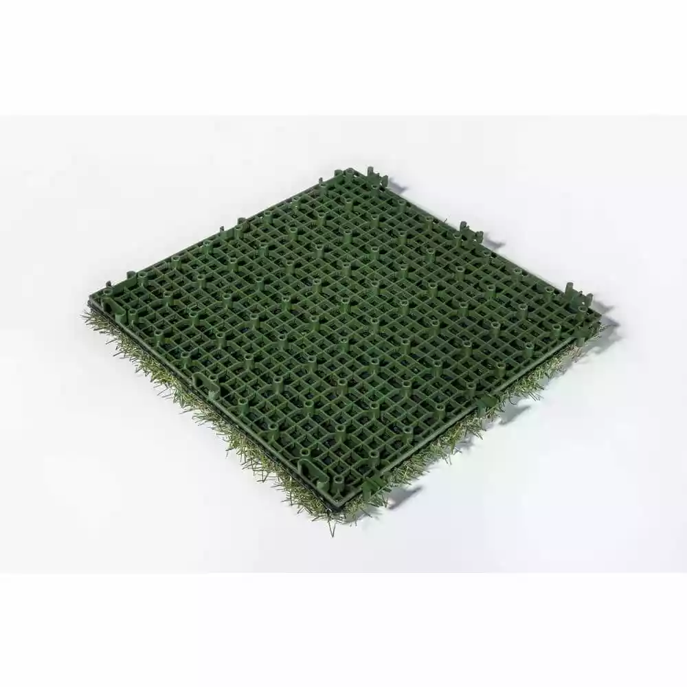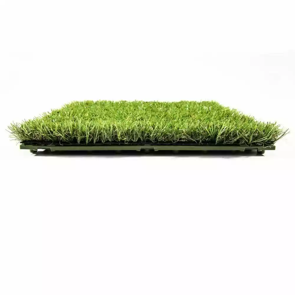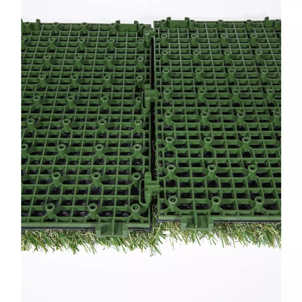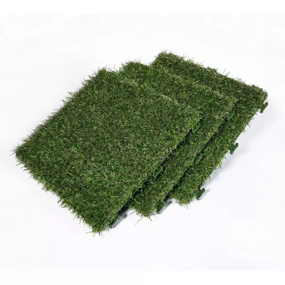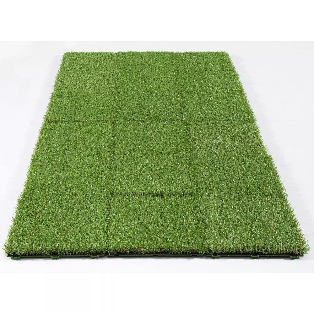 TrafficMaster Artificial Grass 12 in. x 12 in. 9 Piece Set Interlocking tiles make an easy Do It Yourself project. Great for any outdoor setting whether for patio, deck, balcony, outdoor kitchen, poolside, gazebo, basements, etc. the options are endless. Features a durable polyethylene pile with a polypropylene thatch, as well as drain holes for quick and easy draining perfect for outdoor use. Grass pile is approximately 1 tall and upon removing tiles from box, be sure to brush the pile by hand to speed up the opening and relaxation of the yarn bringing this product to its natural state. 1 set (9 tiles) make a perfect square, 2 sets would make a rectangle or L-Shape, the choice is yours as interlocking tiles offer endless options. Be sure to watch our videos and all the product images for visual reference points.