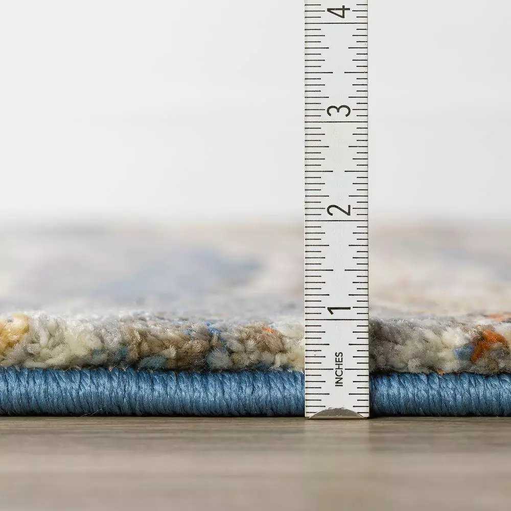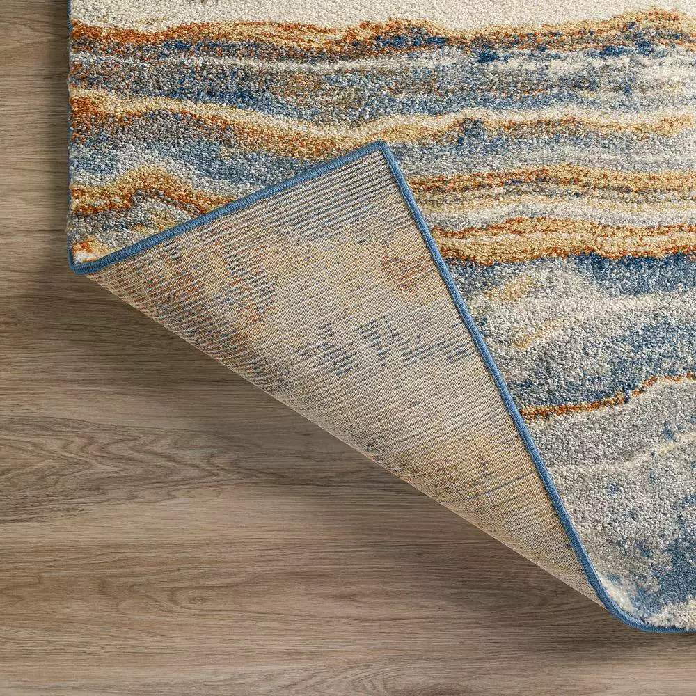 This blue/beige shag area rug has a soft, plush feel underfoot