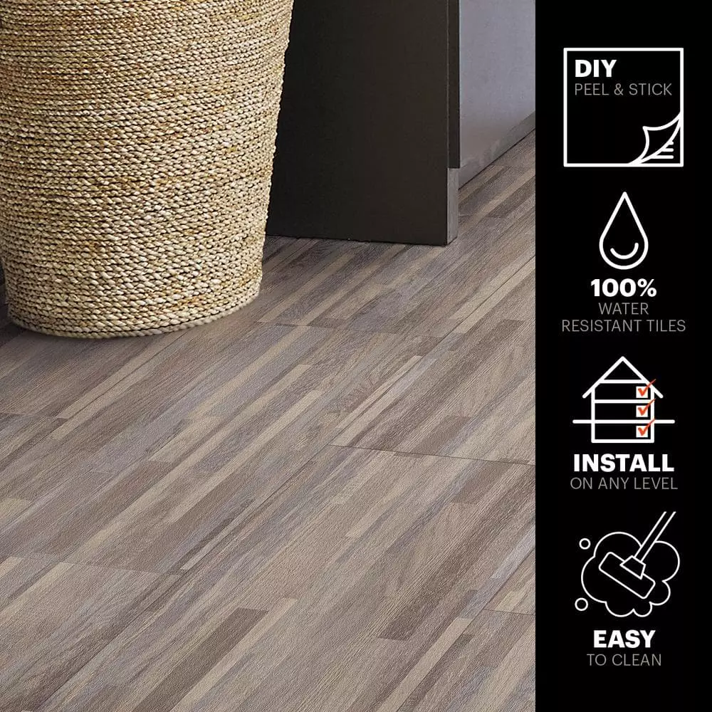 Beach Sand peel n stick tile available in the trendy 12 in. x 24-1/8 in. size. The unique wood look featuring strips of a mixed oak species visual combined with highlights of driftwood are perfect for this larger size format tile. The cutting edge design combined with the self-adhering ease of this tile installation, make this the perfect choice for many places in the home. With the support of a 30 year residential warranty, you can be certain that the performance of this tile will match its beauty.