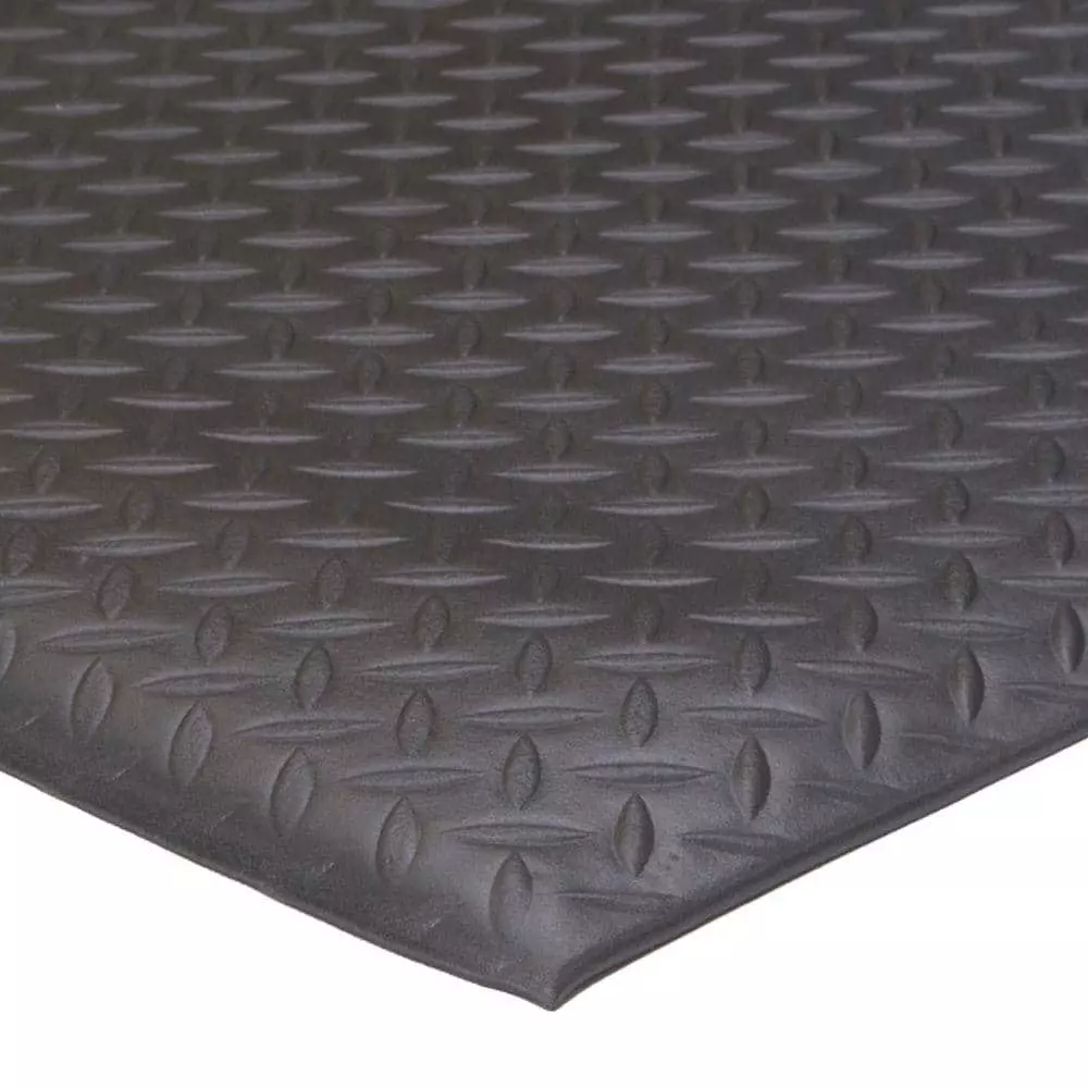 The Apache Mills Black 36 in. x 48 in. Anti-Fatigue Foam Mat reduces stress and fatigue while standing. An embossed diamond pattern surface provides traction. The mat cleans easily when wiped or shaken.