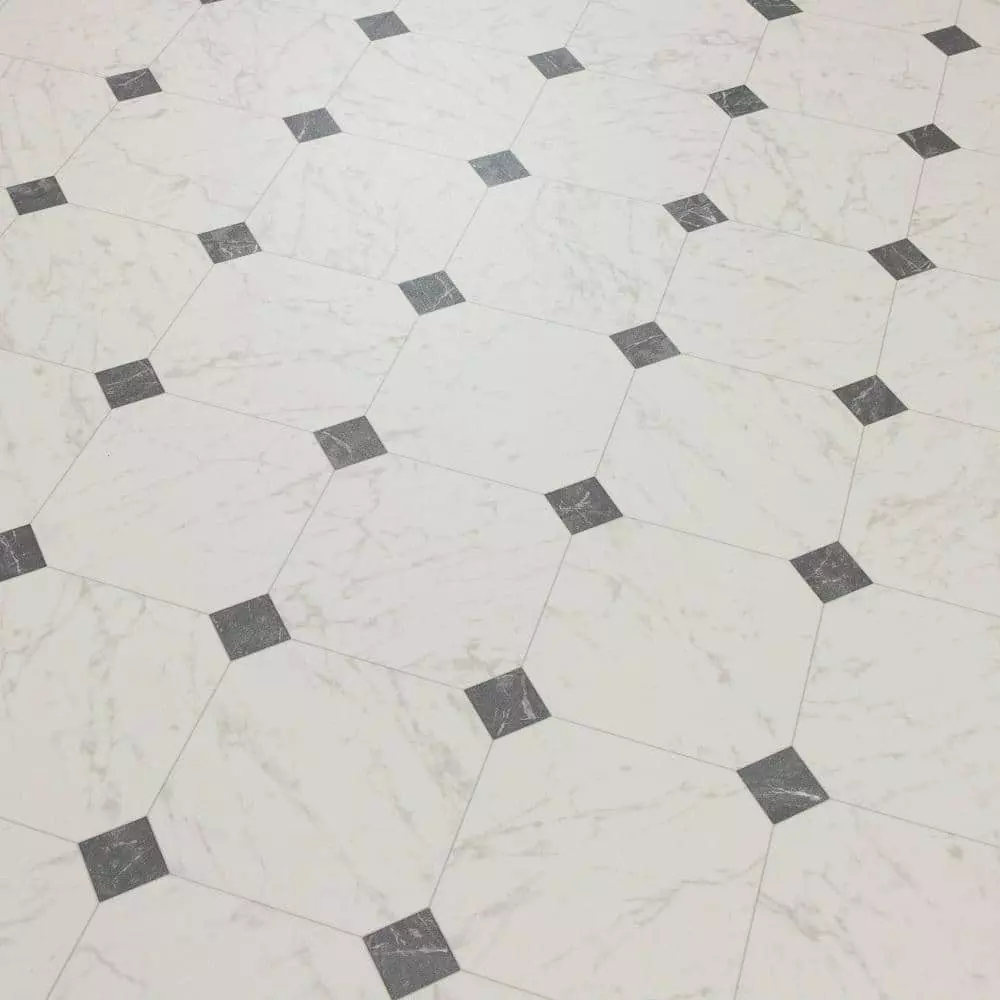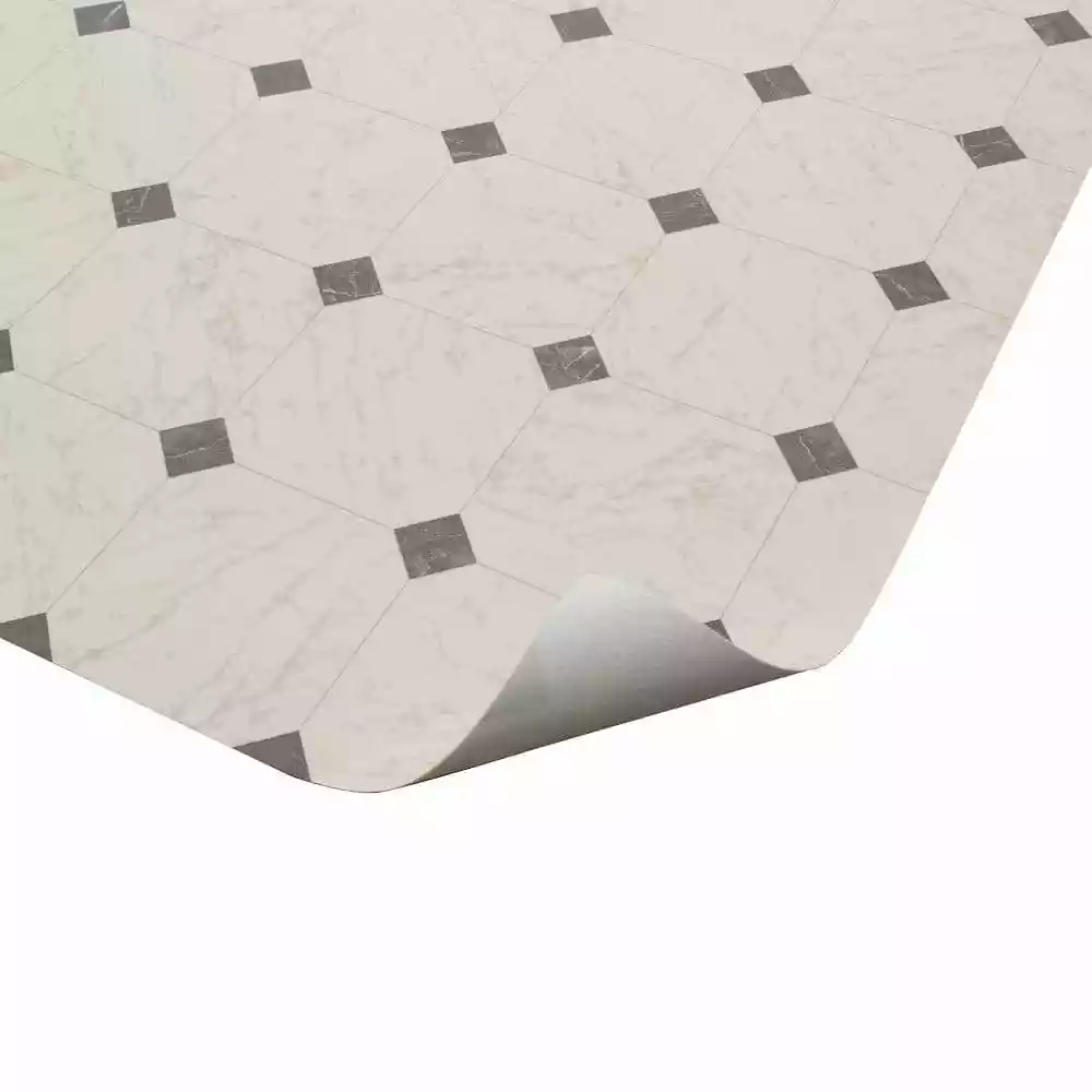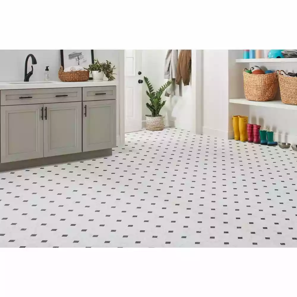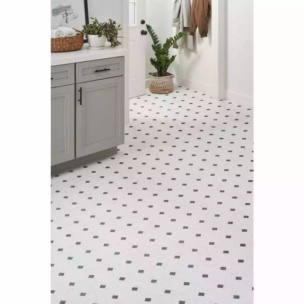 This Black and White Marble Paver from TrafficMASTER brings affordable style to your home. Featuring a black keystone design with marble accents, this classic yet chic paver complements virtually any decor. The PVC wear layer is easy to clean and protects the floor against scuffs, dents and scratches for long-lasting beauty.