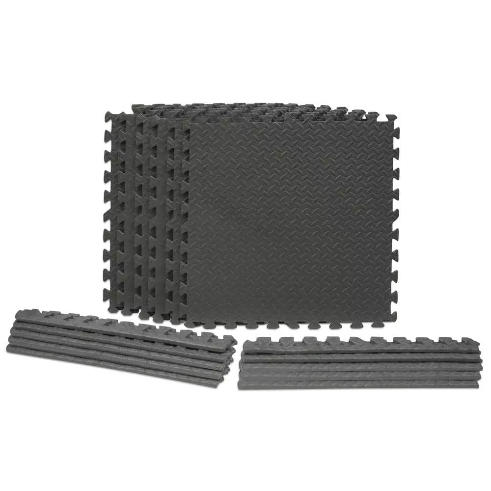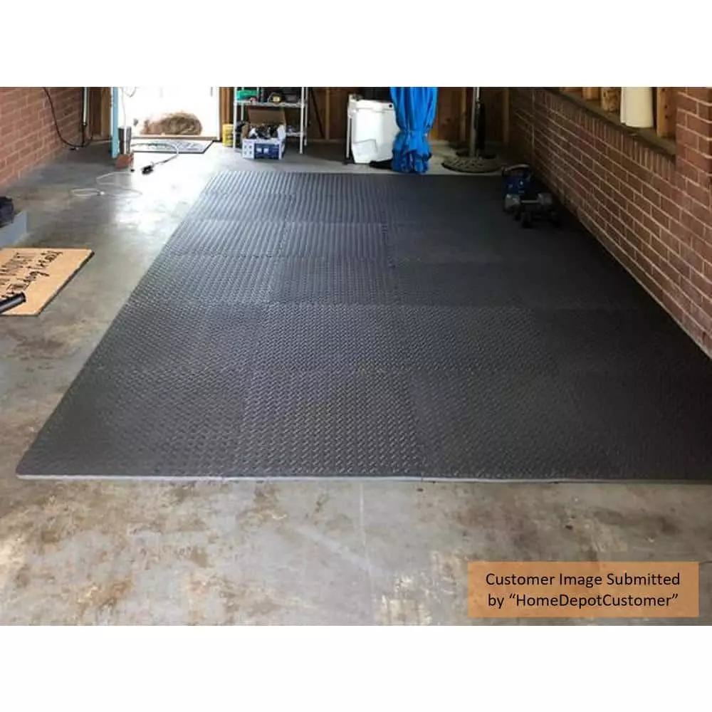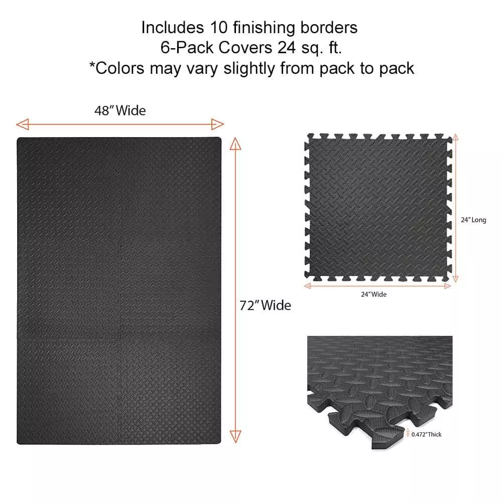 TrafficMaster Indoor Dark Gray Foam Gym Floor Tiles provide cushioning floor protection. This set includes 6 interlocking gym floor tiles and 10 straight edge borders for a finished look. Each interlocking mat gym floor tile is 24 in. L x 24 in. W and 0.47 in. thick. Assembled, the set covers 24 sq. ft. The TrafficMaster Foam Gym Floor Tiles are durable with a textured surface and can be used in many areas throughout the house: home gyms, garages, workshops, mudroom, laundry rooms, basements, play rooms, sheds and more.