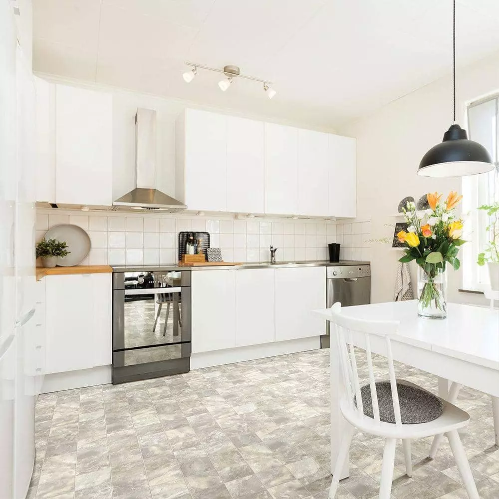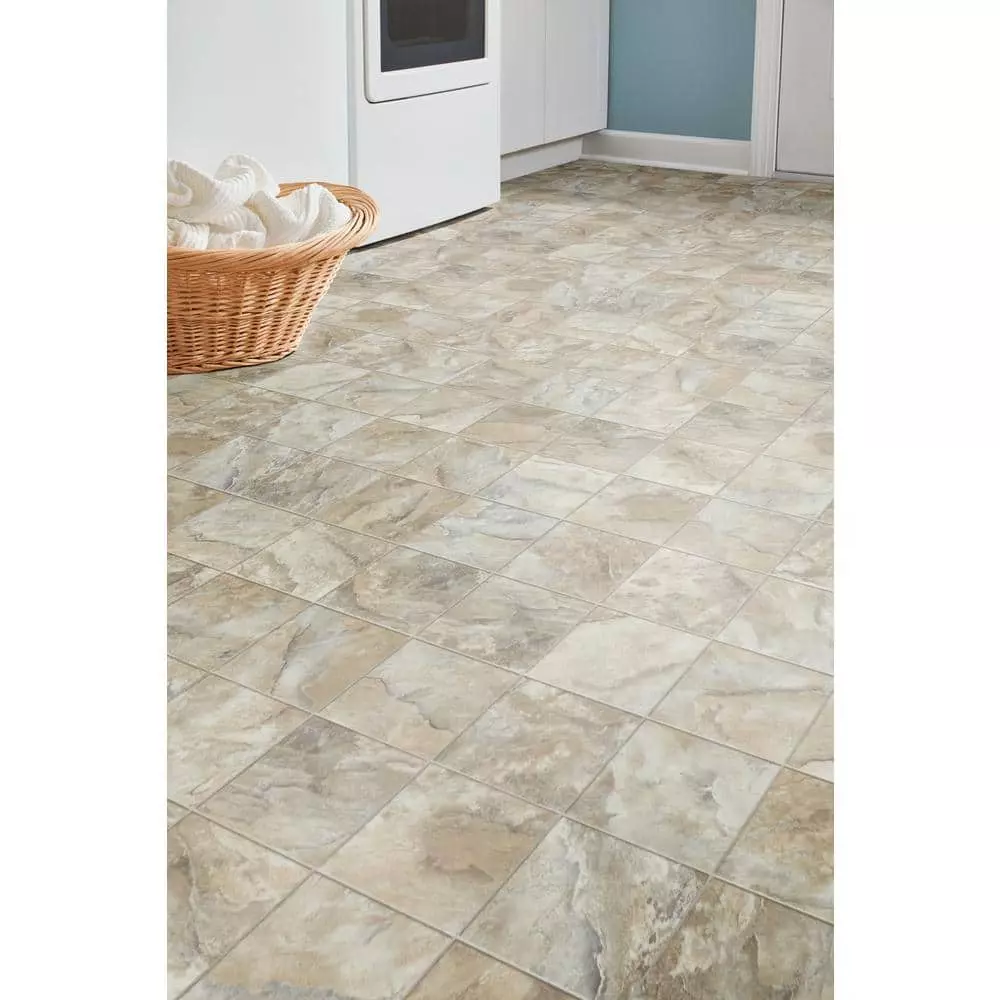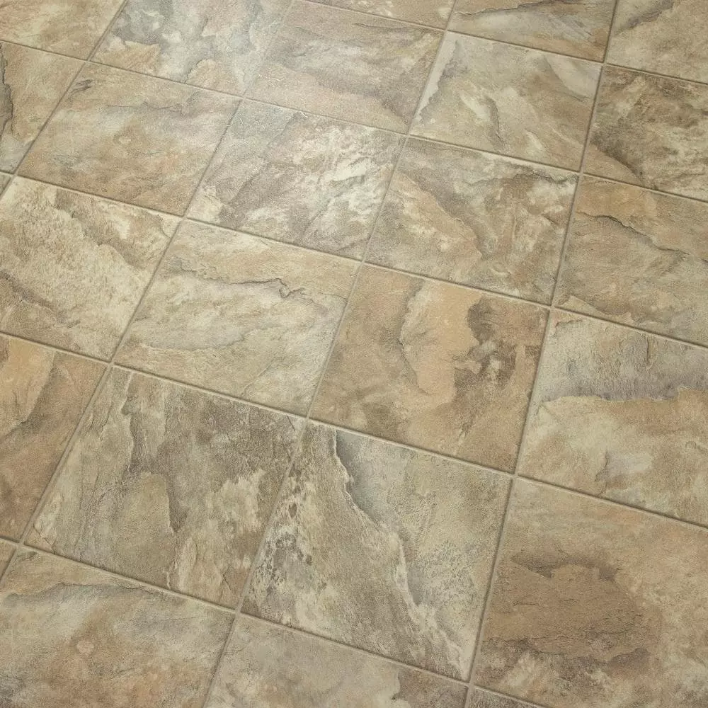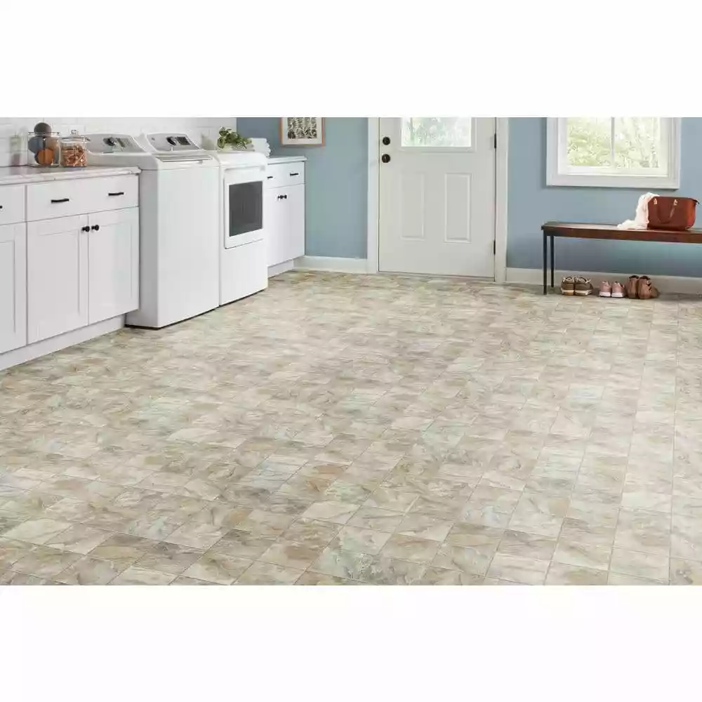 A small-scale slate design in multi-colored neutral tones, the beautiful Neutral Square Slate Vinyl Sheet from TrafficMASTER perfectly complements any decor. Featuring a thick, cushioned backing that provides exceptional comfort and also reduces sound, this flooring is easy to install and even easier to clean. A urethane wear layer provides the toughest protection against common household accidents, ensuring long-lasting appearance and functionality.