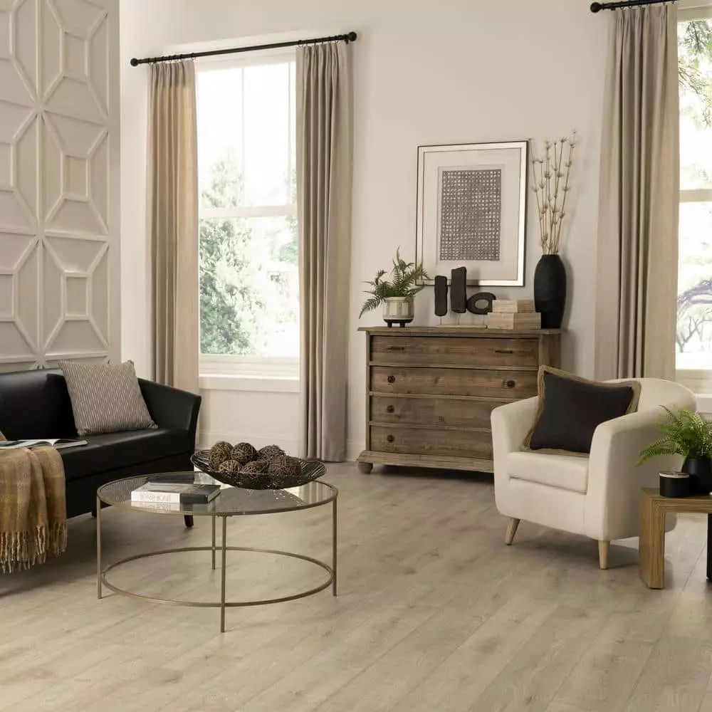 Trafficmaster 8 mm Oak Knoll laminate flooring is a beautiful addition to any home. The wide width, white oak laminate flooring color and embossed finish are able to transcend well beyond just one design style to put itself to work in any home or business. This 8 mm laminate flooring has an authentic oak texture to achieve the look of real hardwood, lending classic elegance to any room. Its durable AC4 wear layer protects against scratching, fading and staining, paired with a limited lifetime residential warranty to ensure decades of lasting beauty and functionality. Designed for residential use, it also features a user-friendly click lock technology to ensure quick and easy installation in any home.